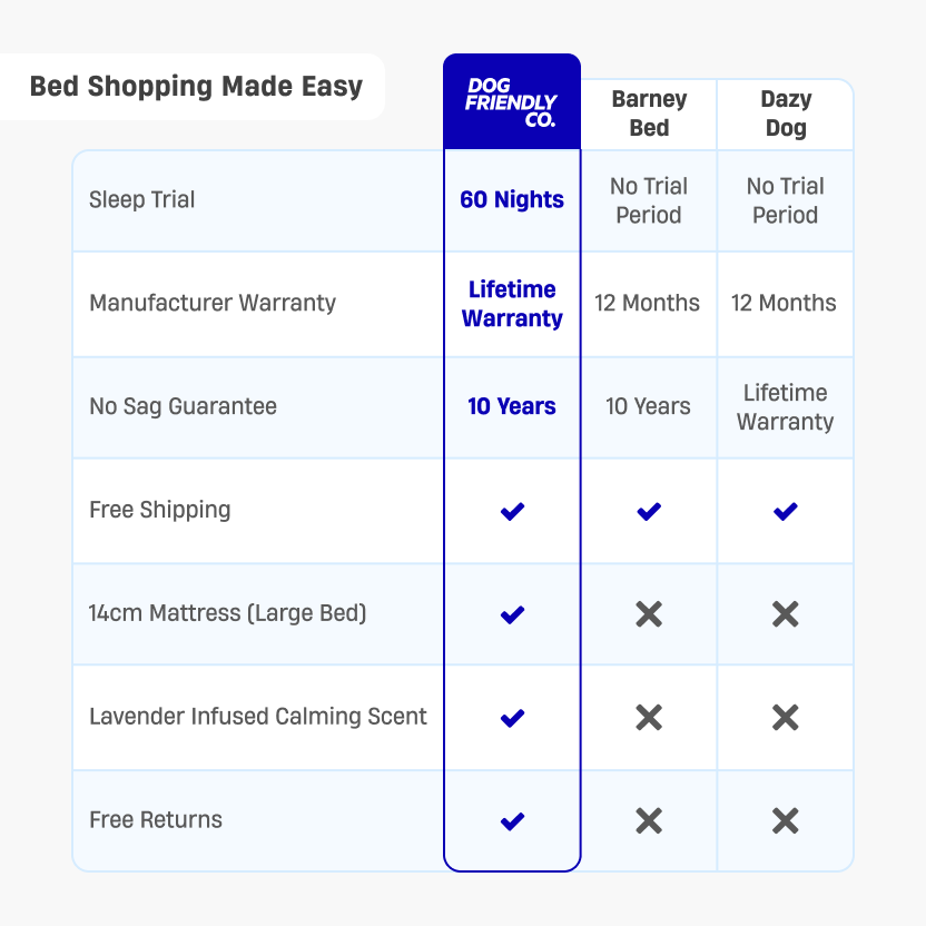 It’s simple. Your dog has 60 nights to try their new bed from the day it arrives. If you or your pup aren’t completely happy for any reason, we’ll take it back and give you a full refund - no questions asked.